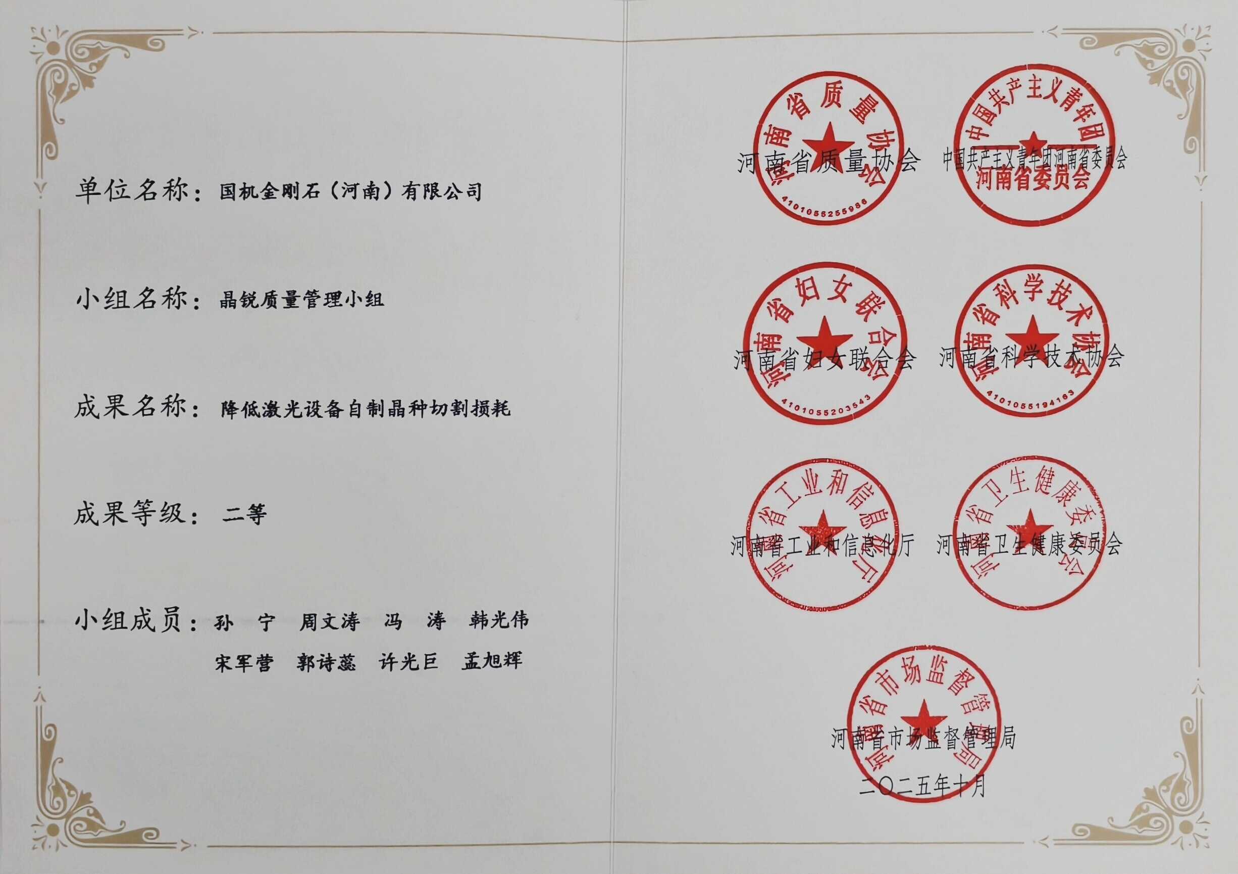 近日,2025年河南省质量协会质量管理小组活动评选结果正式揭晓。其中,三磨超硬QC小组活动课题《提高极薄金属切割刀片烧结成品率》,晶源创科课题《降低激光设备自制晶种切割损耗》,荣获“河南省质量管理小组二等技术成果”;三磨超硬制品三部研磨加工班组、新亚公司质量管理部检验班组荣获“河南省质量信得过班组称号”