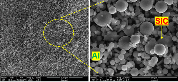▲ 图2 Al和SiC均匀混合状态(球形:Al粉;片状:SiC颗粒)